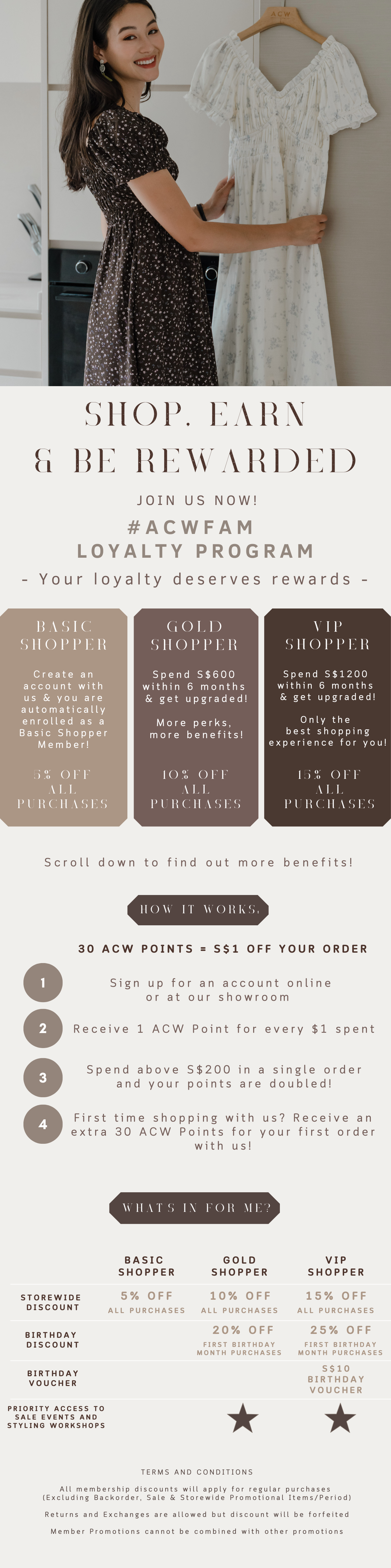 ACW Points are accumulated through purchases of regular priced items (Sale Items do not accumulate ACW Points). S$1 Spending = 1 ACW Point