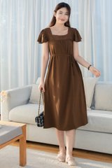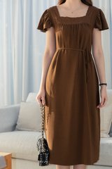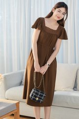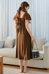 ACW Crotchet Neckline Flutter Sleeve Flowy Midi Dress in Cocoa