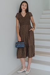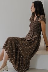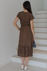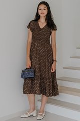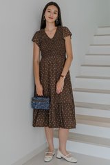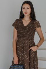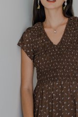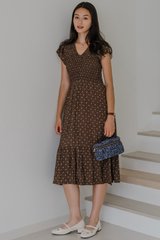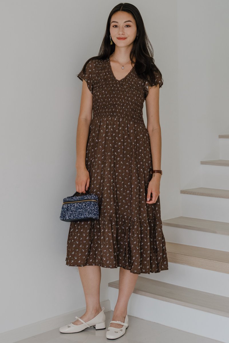 ACW V Neck Flutter Sleeve Smock Midi Dress in Cocoa Florals